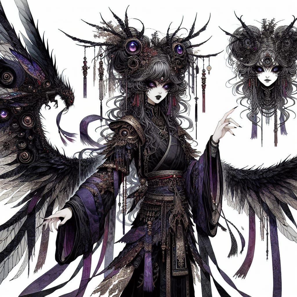 A striking picture of a dark magic fairy with spider-inspired features. The fairy has multiple eyes, shimmering spider silk wings, looming claws and is adorned with tattered black and purple silk ribbons in an anime style.