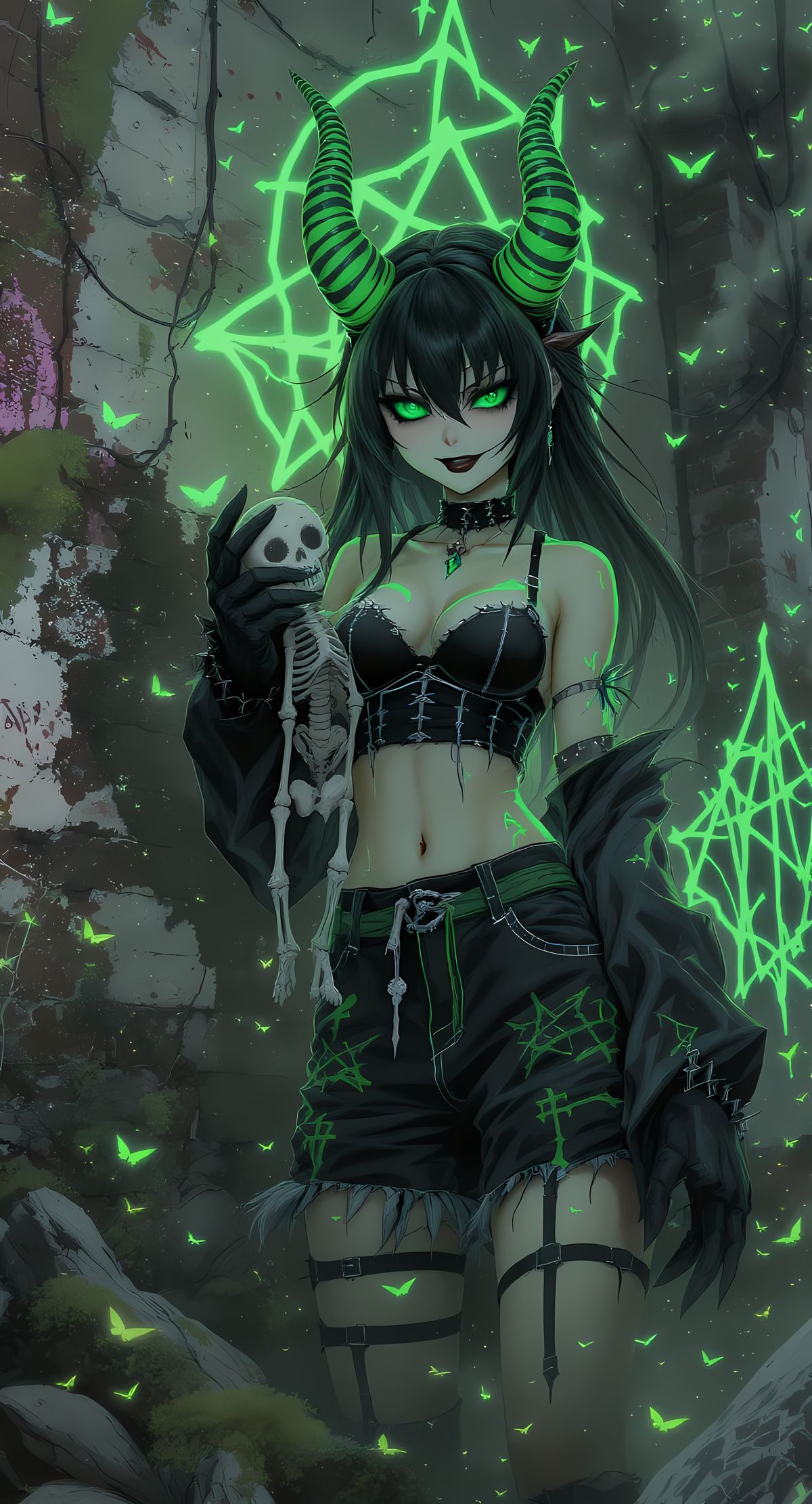 This image shows a gothic punk girl in an anime style standing in an urban wasteland filled with neon sigils, green moss and graffiti. She is holding a stitched skeleton doll.