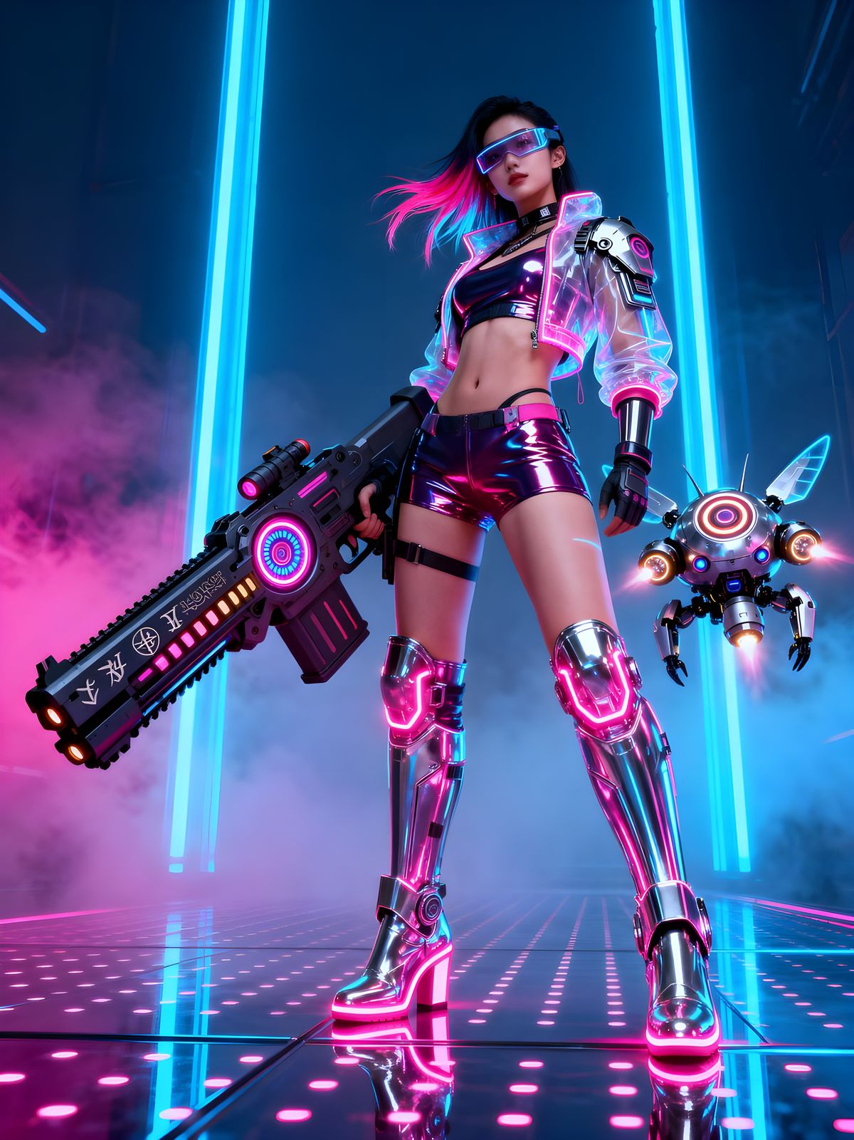 This image shows a seductive female cyberpunk enforcer in neon latex and armor, wielding a massive sci-fi cannon. A detailed battle drone accompanies her, set against a backdrop of neon lights and fog. Rendered with photorealistic textures and high contrast lighting.