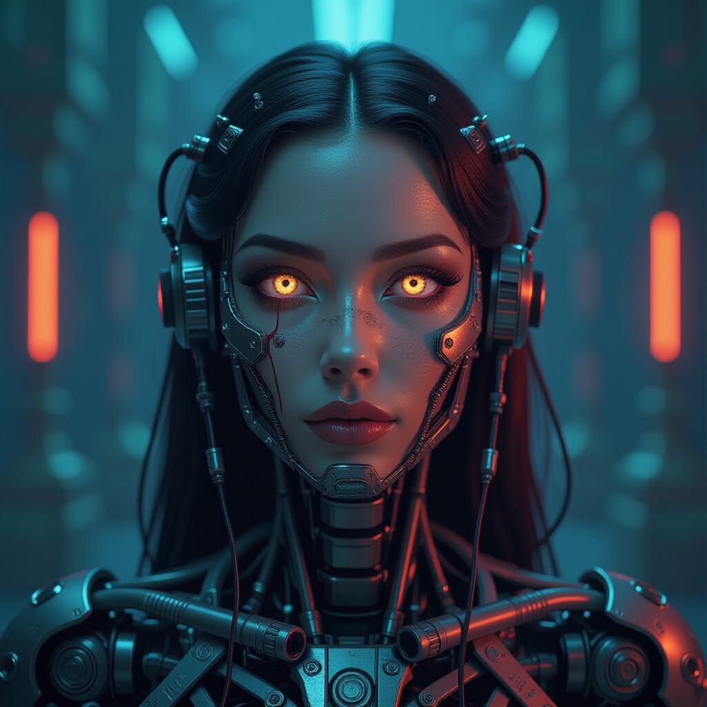 This striking image features a photorealistic portrait of a mechanical girl with glowing eyes and intricate cybernetic enhancements. The scene blends detailed metalwork with Egyptian motifs and neon lights.