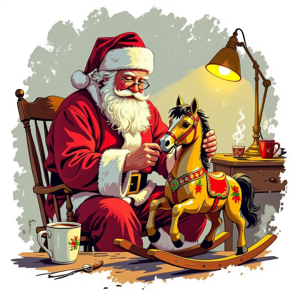 This image shows Santa Claus in his workshop, repairing a rocking horse. The illustration features warm, nostalgic lighting and detailed textures, reminiscent of classic artwork.