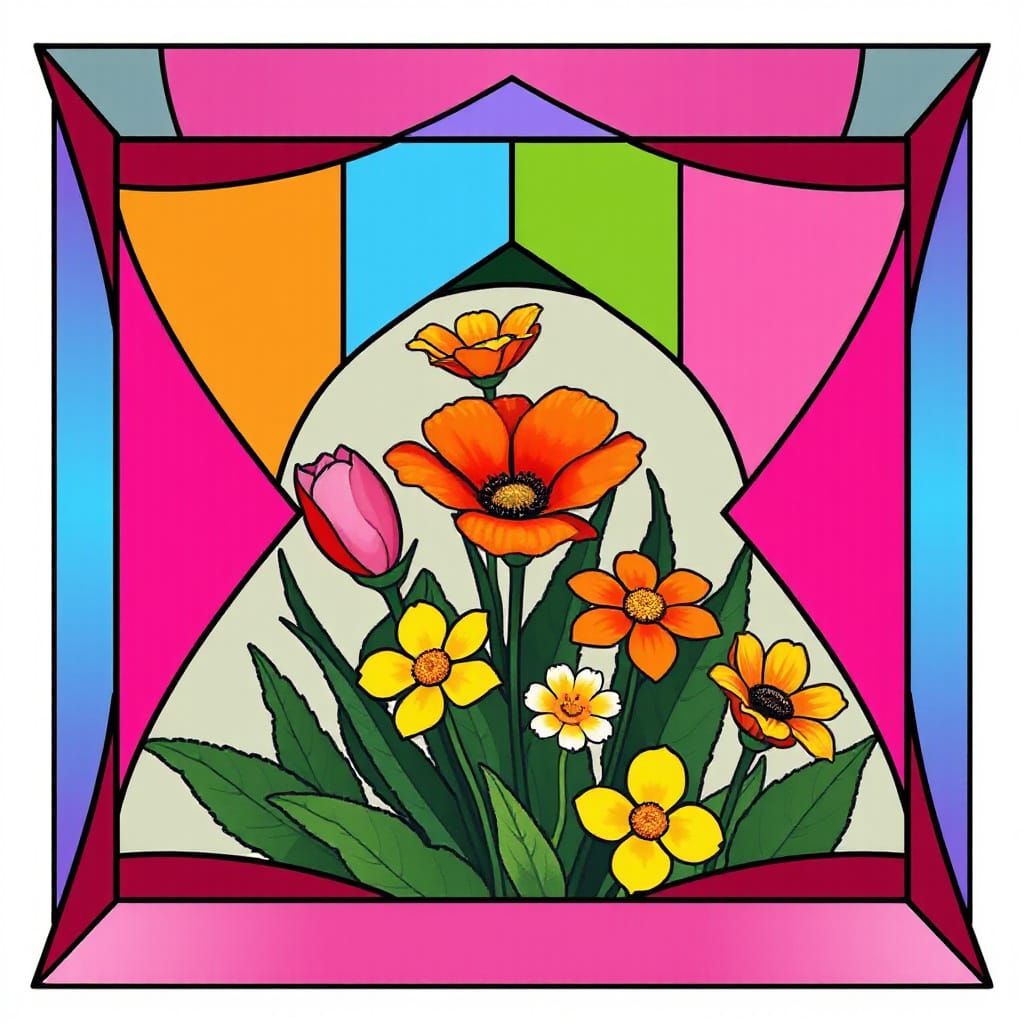 Geometric abstraction, April, flowers in a garden. Interlocking geometric shapes in bright colors. Bold, black outlines. Empty space around the edges. Balanced composition. Bright and minimalist aesthetic. Vibrant, contrasting colors. Clean lines. Art deco patterns. Geometric shapes. Vector art. Minimalist. ...