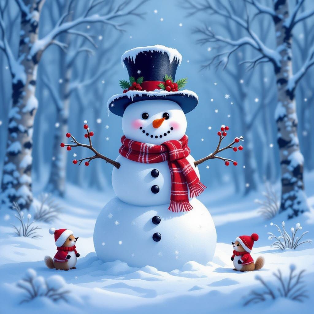 A whimsical, enchanted snowman sculpted from freshly fallen snow stands proudly in a frost-kissed winter forest clearing. He is adorned with a top hat made of delicate ice crystals and a scarf woven from glowing winter berries. Surrounding him are tiny woodland creatures dressed in miniature festive ...