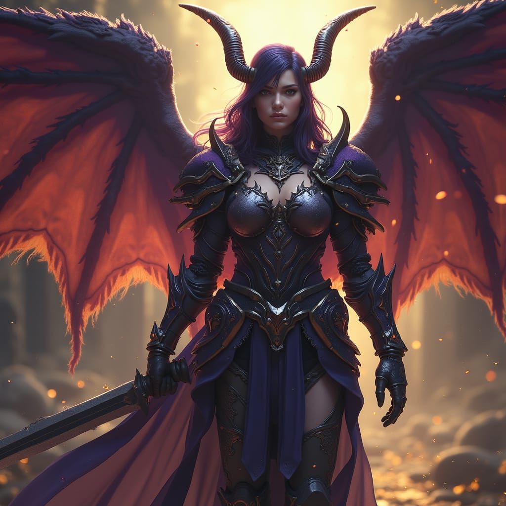 This image shows a stunning female Satyr Cleric clad in heavy armor, set against a dark fantasy backdrop. The artwork features intricate details, vibrant colors, and dynamic lighting, blending the styles of Mucha and Grimmer with a touch of fantasy flair.