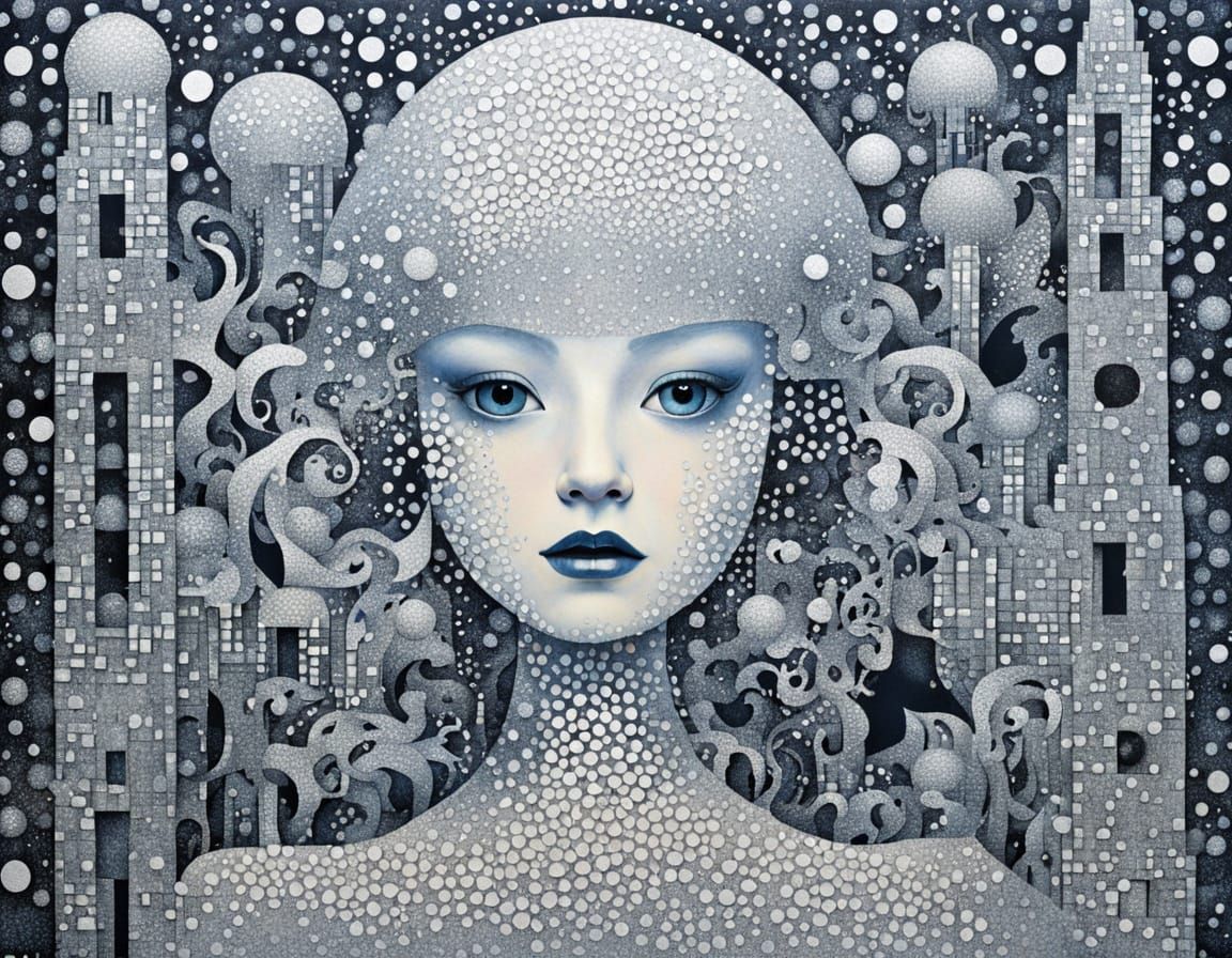 This image depicts Santa Claus in a funky, frosted fantasy scene. The artwork combines Cubist and Pointillist techniques for a unique visual experience.