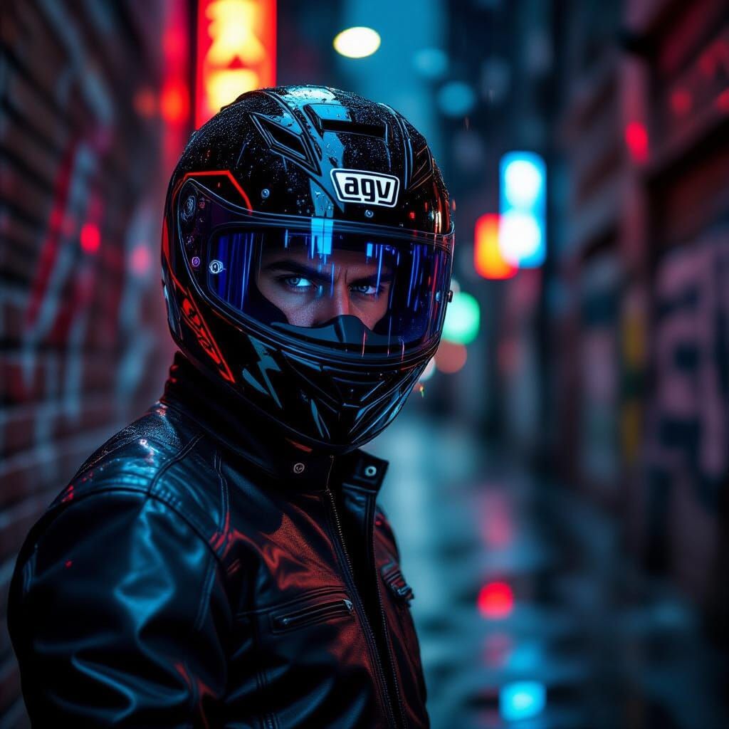 This image shows a biker in an alley at night, surrounded by rain. He wears a glossy black helmet with a blue reflective visor, and a black jacket. Neon reflections shimmer in the background creating a cyberpunk aesthetic.