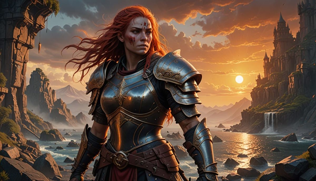 This image shows a strong female barbarian standing at sunset, surrounded by warm golden light and deep colors, with intricate detail and realistic textures in a style reminiscent of oil painting.