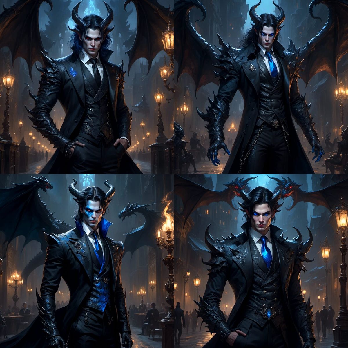 A striking picture of a dragon-like demon in human form, a god of death with black hair and blue eyes. The figure is depicted with nocturnal scales and chained horns in a dark alley, rendered in 4K HDR.