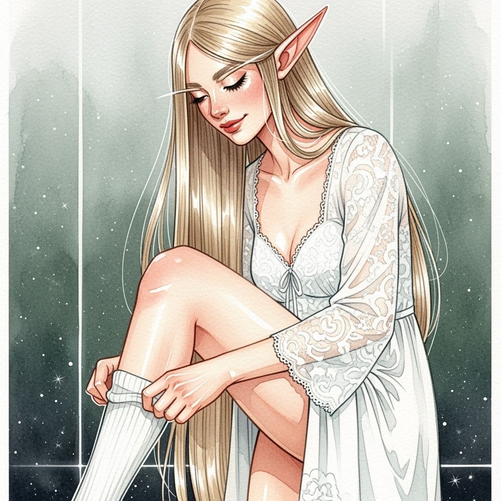 This image shows a white elf in a white lace peignoir. The close-up watercolor drawing features long wheat-colored hair and a soft smile, with a blurred, gray-green background and sci-fi neon glow.