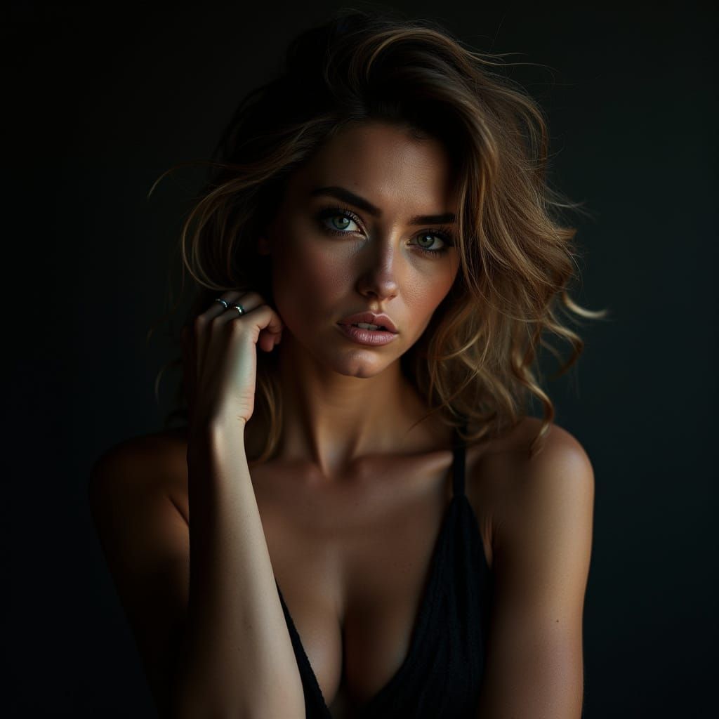 This image showcases a stunning woman with windswept hair and dramatic makeup, embodying rough glamour. Cinematic photography highlights her intense gaze and mysterious allure with high contrast lighting.