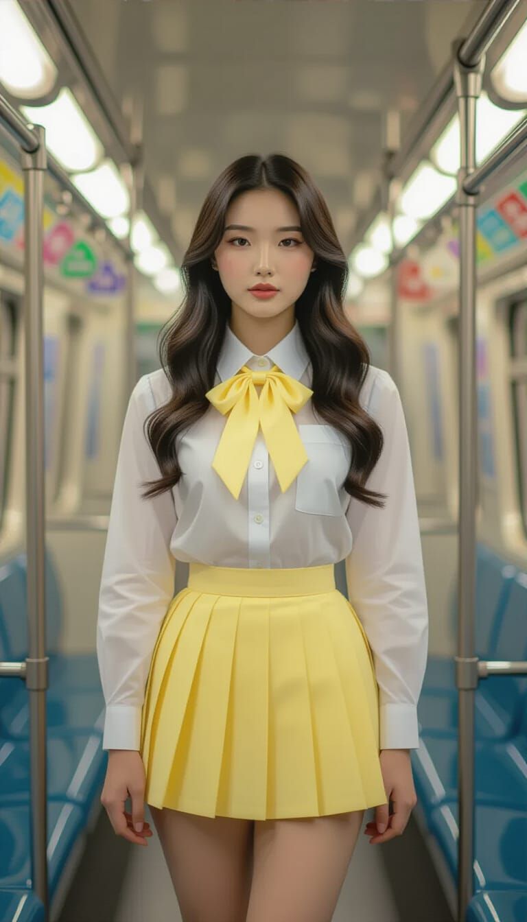 This image shows a beautiful East Asian woman in a schoolgirl uniform standing in a subway train. The photorealistic image features soft lighting and a shallow depth of field.