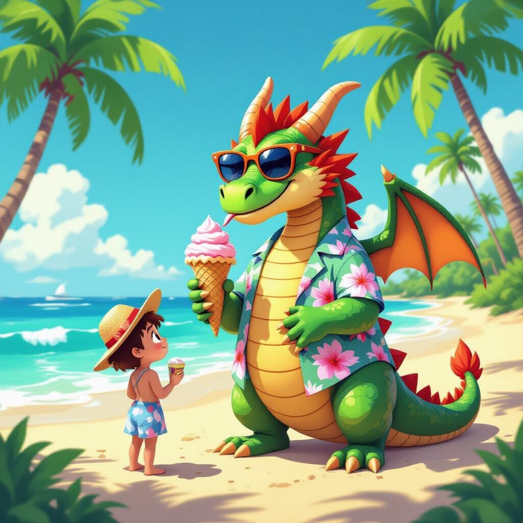 This image shows a colossal dragon in a Hawaiian shirt and sunglasses trying to buy ice cream from a tiny vendor. Rendered in a vibrant cartoon style with bold outlines and cheerful colors.