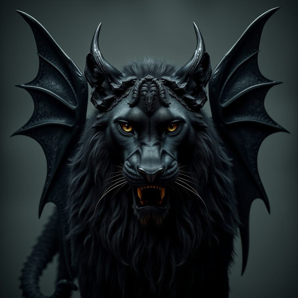 This image depicts a stunning black lioness with bat wings, blending the elegance of a lion with the mystery of a devil. Her striking appearance is a testament to the fusion of feline and demonic features.