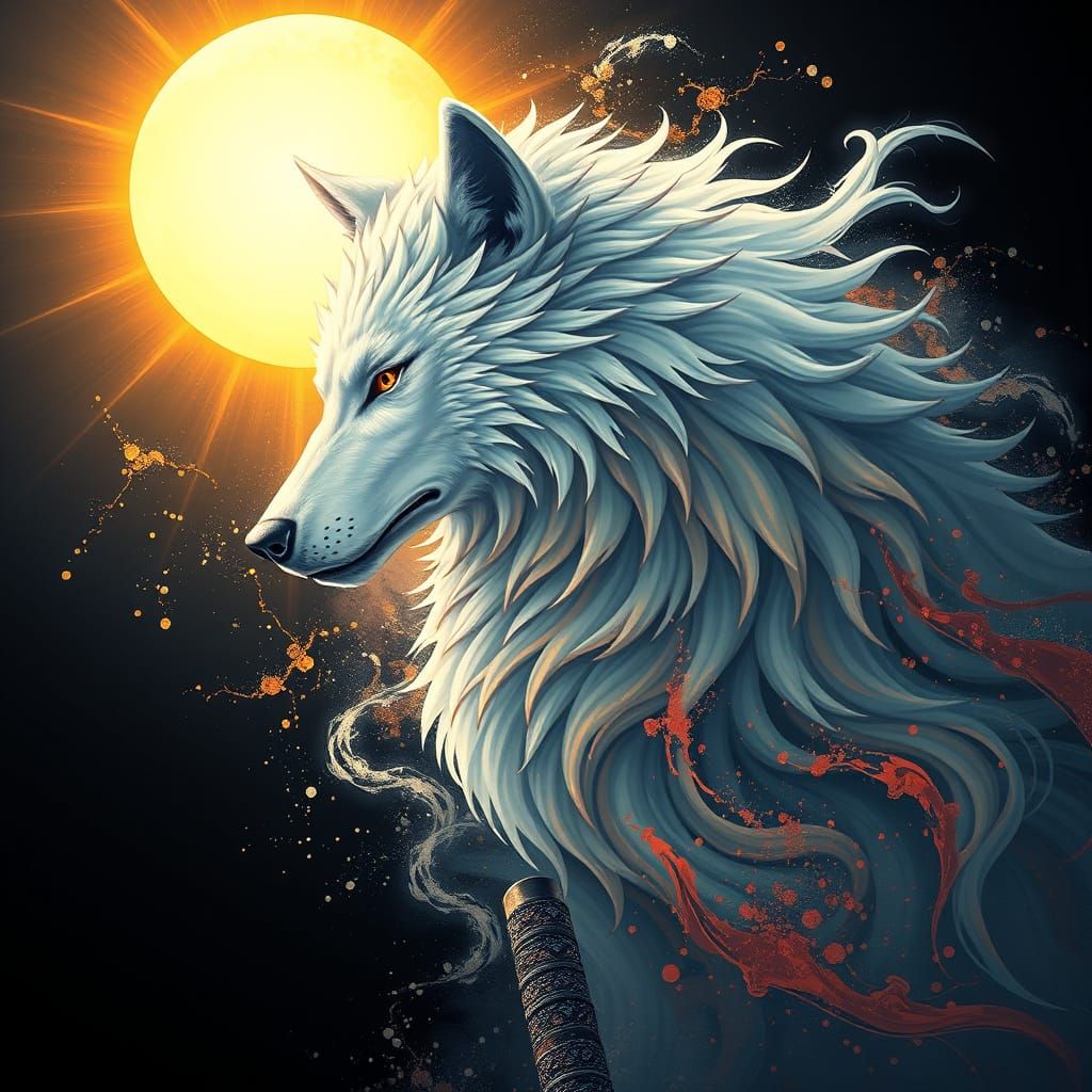 This stunning digital art piece depicts the Japanese goddess Amaterasu as a radiant white wolf, surrounded by an inky black background, reminiscent of traditional Ukiyo-e art. The warm glow of her presence illuminates the dark surroundings, showcasing intricate details and vibrant colors in a dramatic, o...