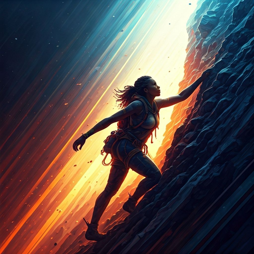 A hyperrealistic concept art piece shows a determined Black woman scaling Mount Olympus, featuring dramatic lighting and vibrant color depth in a bold, high-contrast style.