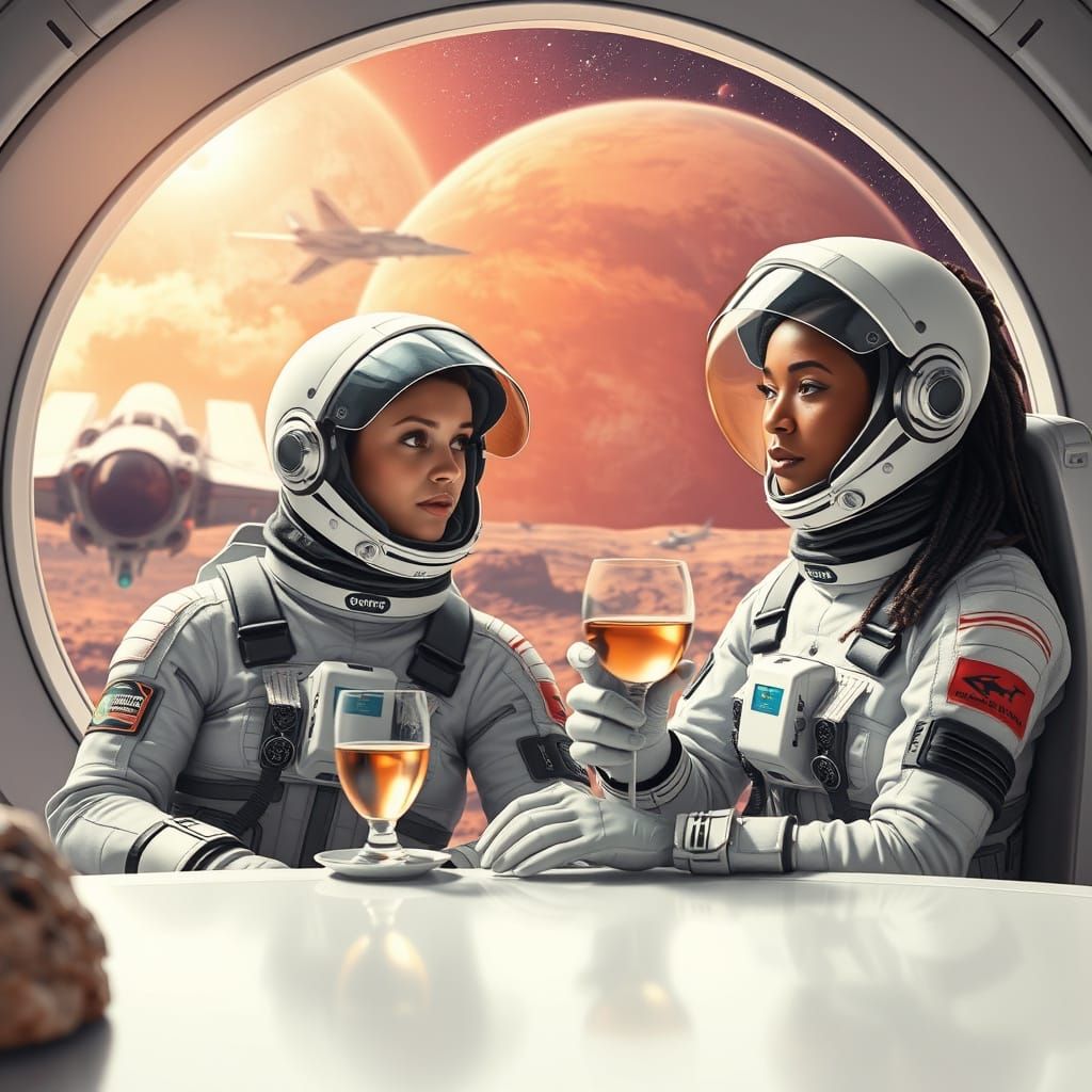 This image depicts two women, an extraterrestrial cosmonaut with turquoise skin and an African astronaut, chatting in a futuristic space café on a small asteroid. The scene is set against a colorful starry background featuring Mars and Earth, with their spacecraft and a robotic server.