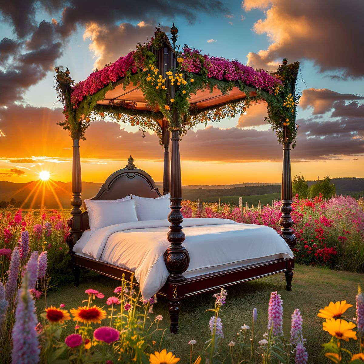 This image shows an elegant four-poster bed situated in a vibrant valley filled with wildflowers, captured during a serene sunset with natural lighting. The image is reminiscent of professional photography.