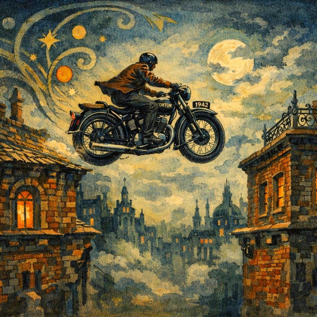 This surreal matte painting depicts a motorcycle attempting a daring jump between buildings, rendered in a dark academia aesthetic with gouache and acrylic art elements.
