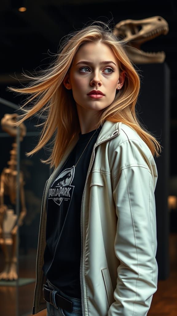 A striking picture of a woman in a museum with dinosaur exhibits. The cinematic image evokes a fantasy portrait, with dramatic lighting enhancing the vintage and paleontological atmosphere.