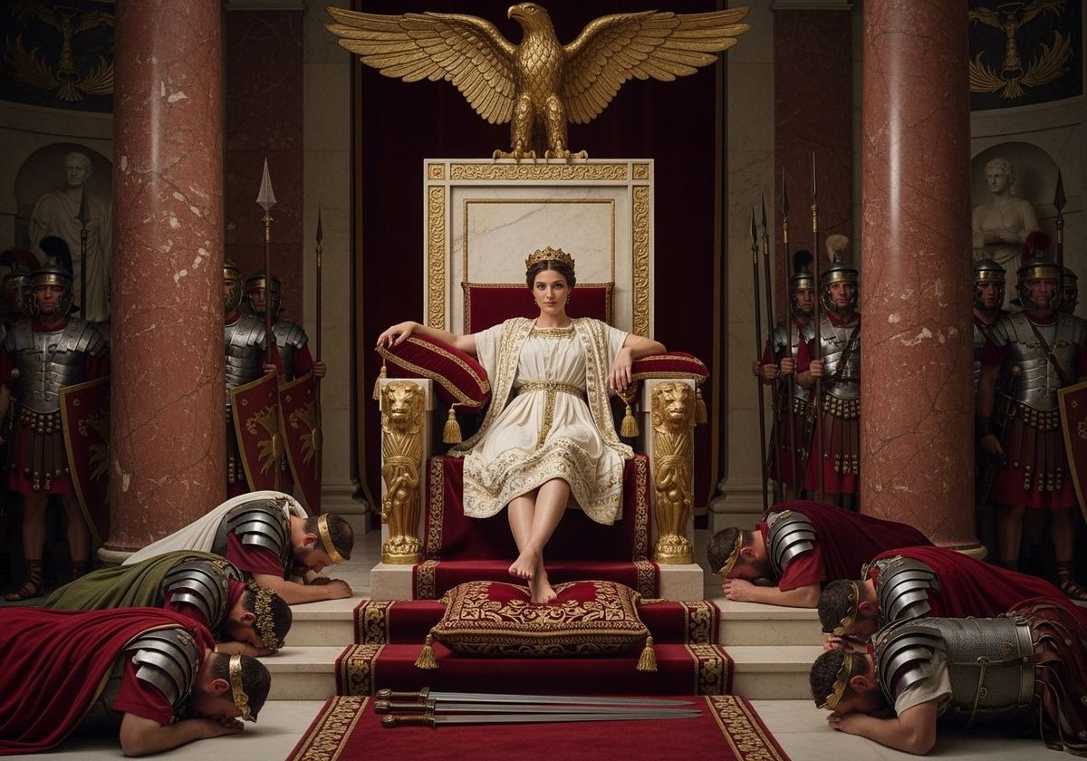 This image depicts Empress Messalina on a huge throne, constructed from marble, gold and emerald. Defeated kings crawl before her while legionnaires stand guard in the luxurious throne room. The artwork evokes classical painting.
