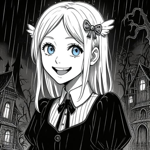 This image shows a woman with blonde hair and blue eyes wearing a Wednesday Addams-inspired outfit and angel hair clips. The black and white manga-style artwork features bold lines and dramatic shading.