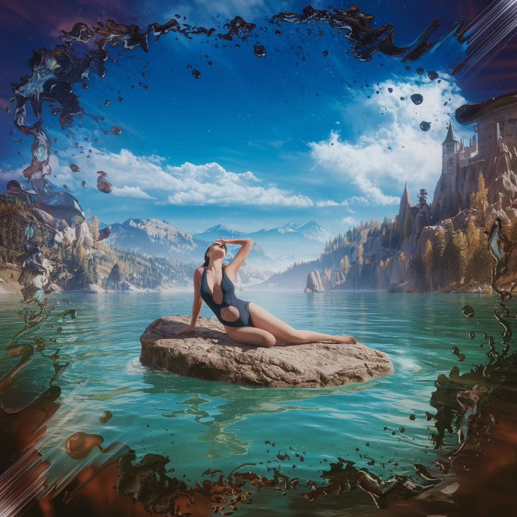 This image shows a stunning Israeli woman in a serene seaside setting, surrounded by lush mountains and a majestic castle. The scene is a vibrant, fantasy world with intricate details and deep colors, evoking a sense of tranquility and wonder.