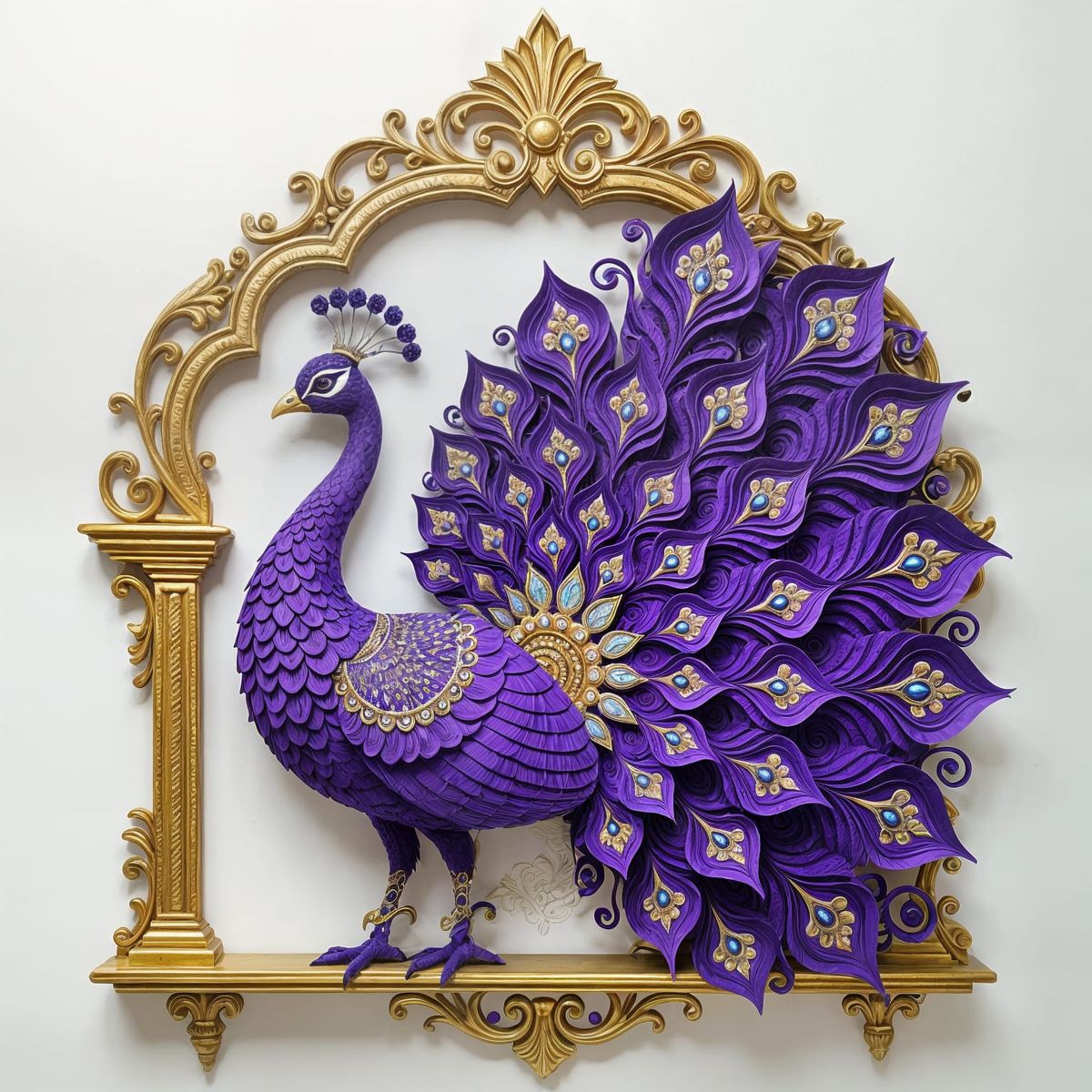 This image showcases a majestic peacock crafted from layered paper, featuring intricate Indian patterns and Baroque style. Rich purple hues with gold filigree highlight its dramatic, cascading tail feathers.