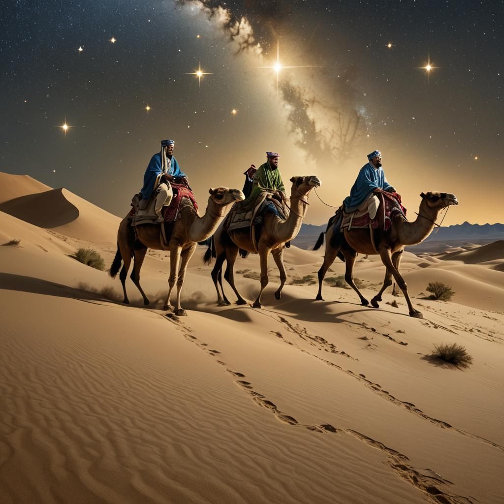 A striking picture of the biblical three wise men riding camels across a sand dune at night. Golden light illuminates the desert landscape under a starry, celestial sky in this 8k resolution digital art.