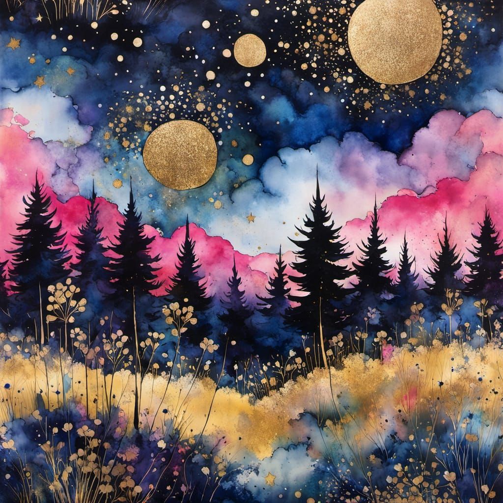 encaustic surreal ink and splatter watercolor of a meadow, misty golden stars in the background, glitter, bold splashes of gold, dark indigo, pink and black, rich saturated colors and masterful light effects, layered, textured brushwork, grain, noise, wood grain, modern impressionism