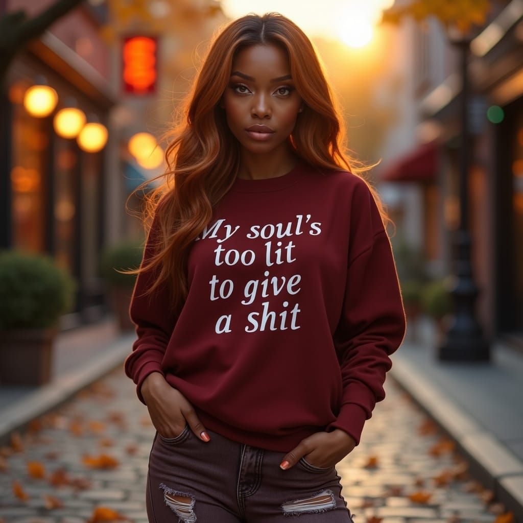 This photorealistic image captures a confident Black woman with glowing skin and ginger hair on a fall-themed cobblestone street. She sports a silver grill and a bold sweatshirt.