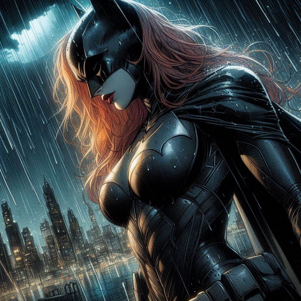 DC comics, color comic pencil sketch style, close up, Batwoman standing on a modern gothic city rooftop, black batsuit, black skies, downpouring rain, heavy rainfall, dark thunderstorm, night ambient light, pitch black darkness, heavy shadows, big chested, high contrast, highly saturated, dark colors, ...