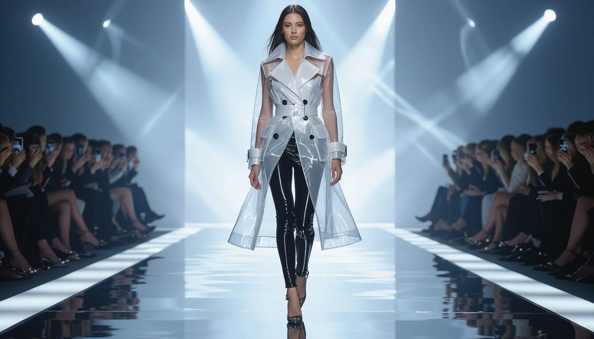 This image shows a woman in a transparent trench coat striding down a mirrored runway. The scene is set at a high-fashion show, complete with photographers and specular lighting, rendered with immaculate reflections.