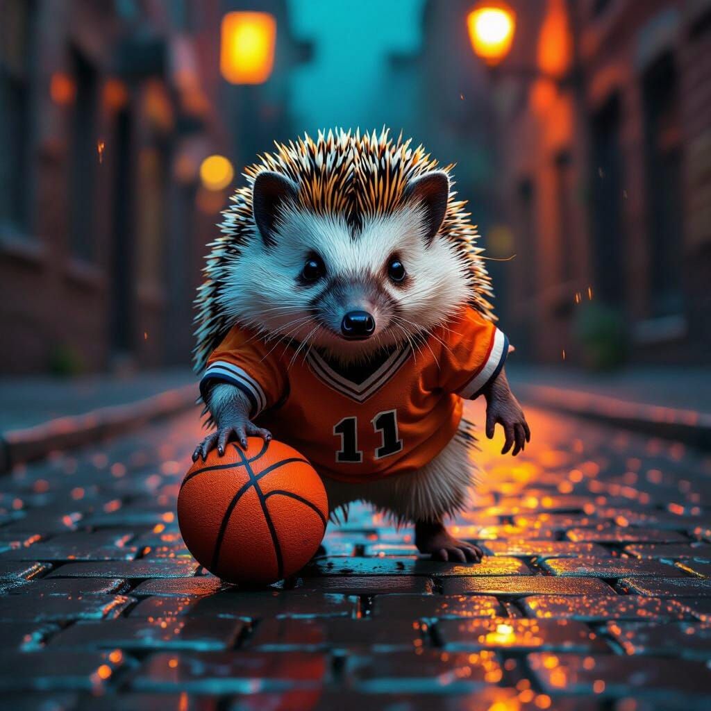 A vibrant pop art image of a hedgehog playing basketball on a wet, cobblestone street. The hedgehog's quills glisten in the light, rendered with realistic detail and bold colors.