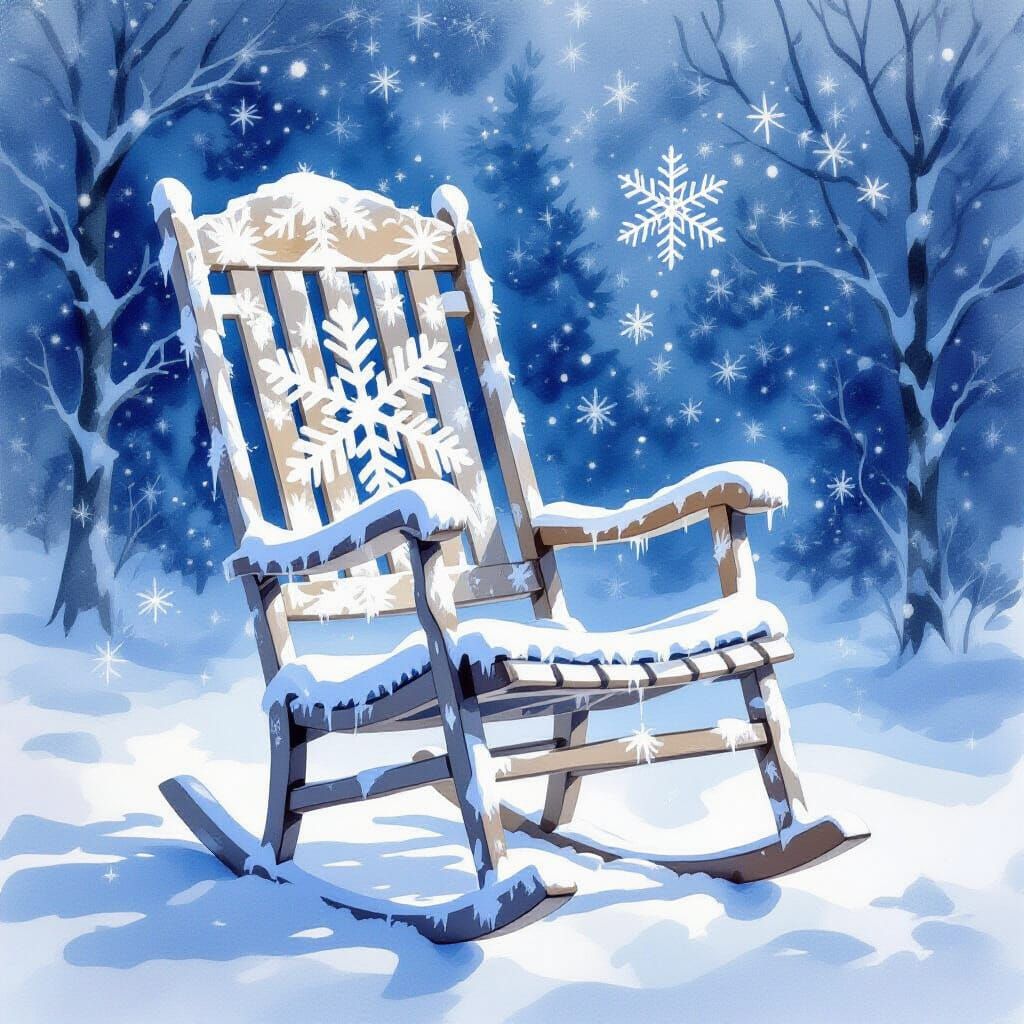 This image shows a rocking chair constructed from snow and snowflakes, rendered in a watercolor style. The artwork captures a whimsical, wintry aesthetic.