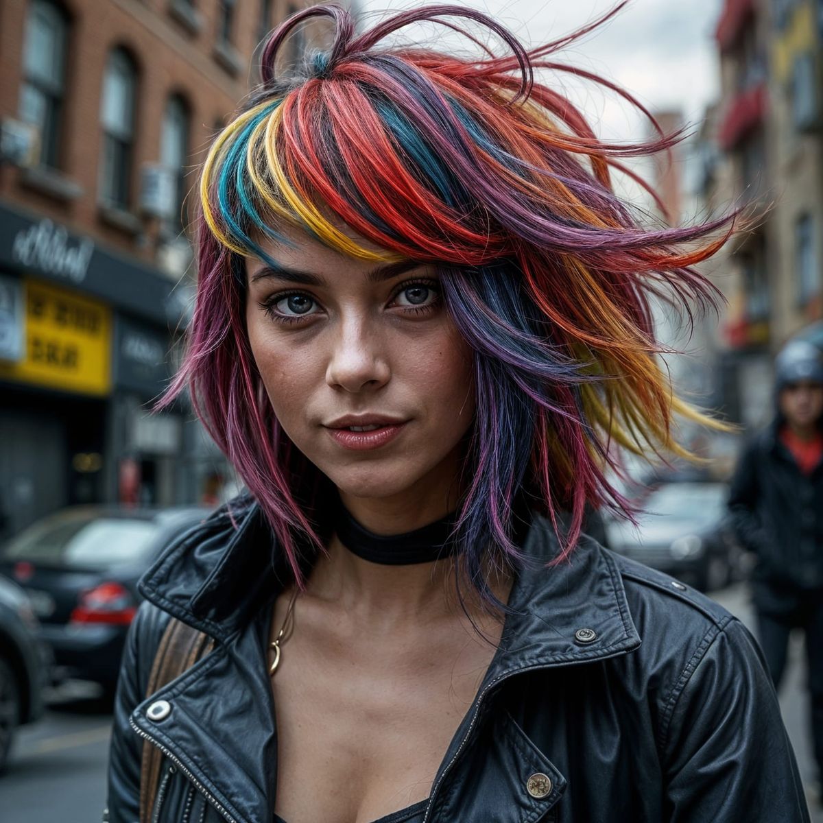 This image shows a young woman with a vibrant personality, featuring bright and bold hair colors.