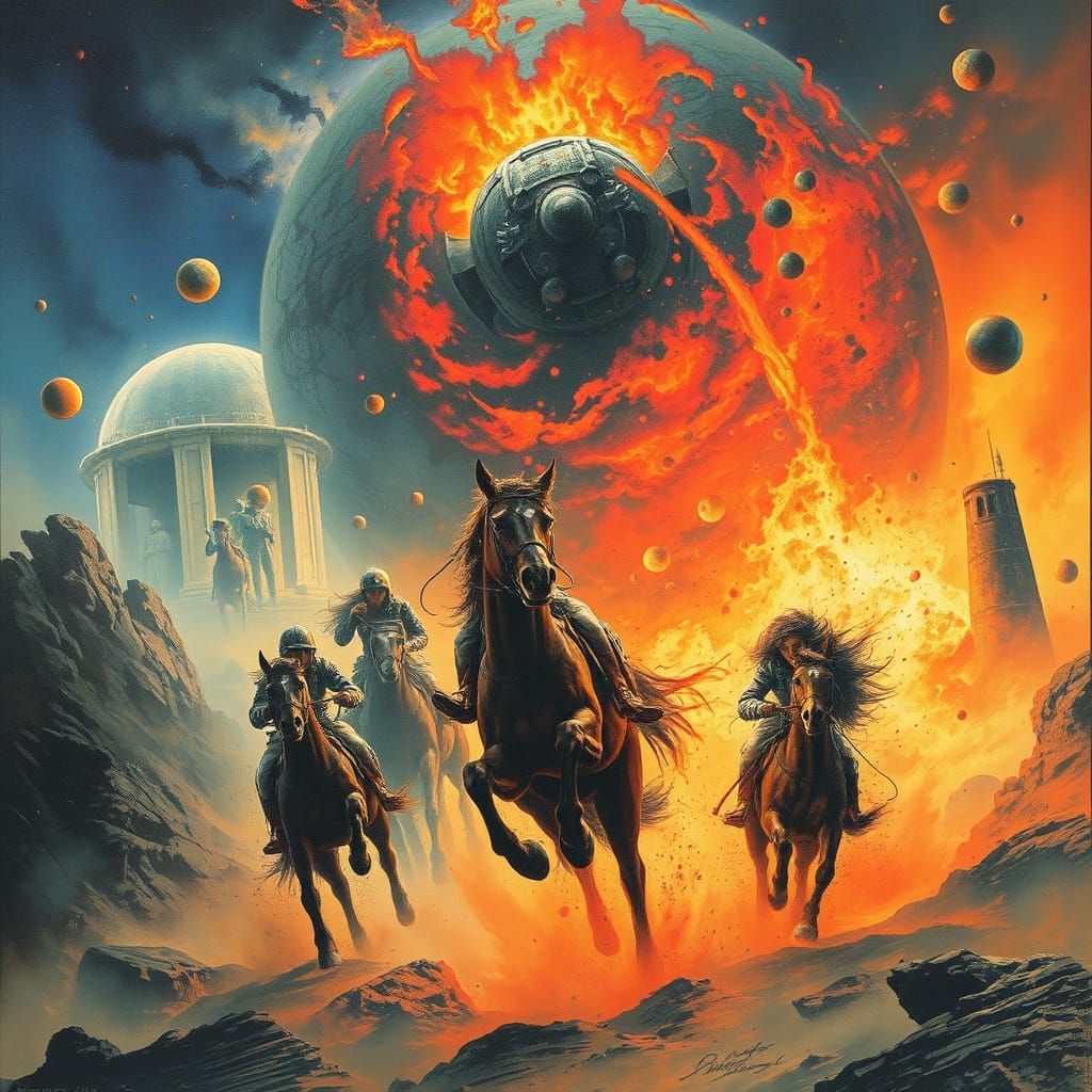 This image shows a dystopian sci-fi chase scene. It is rendered with dark, surreal elements and vibrant colors, creating a chaotic and otherworldly atmosphere in a unique style.