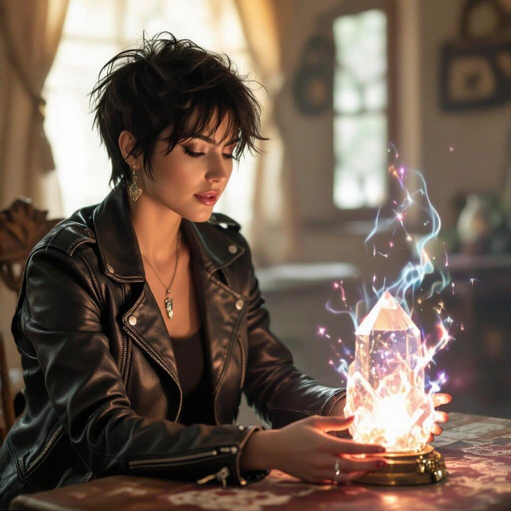 A striking image of a young woman transformed into a biker goddess, with her mother also undergoing a dramatic, stylish metamorphosis. The scene captures a moment of disbelief and wonder.