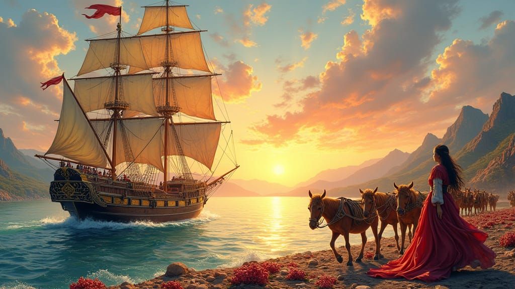 This vibrant image depicts a majestic Roman merchant ship and a Chinese trade caravan converging on a scenic horizon, with precious silk and wine spilling from each side, entwining the two cultures in a dynamic dance of commerce and exchange.