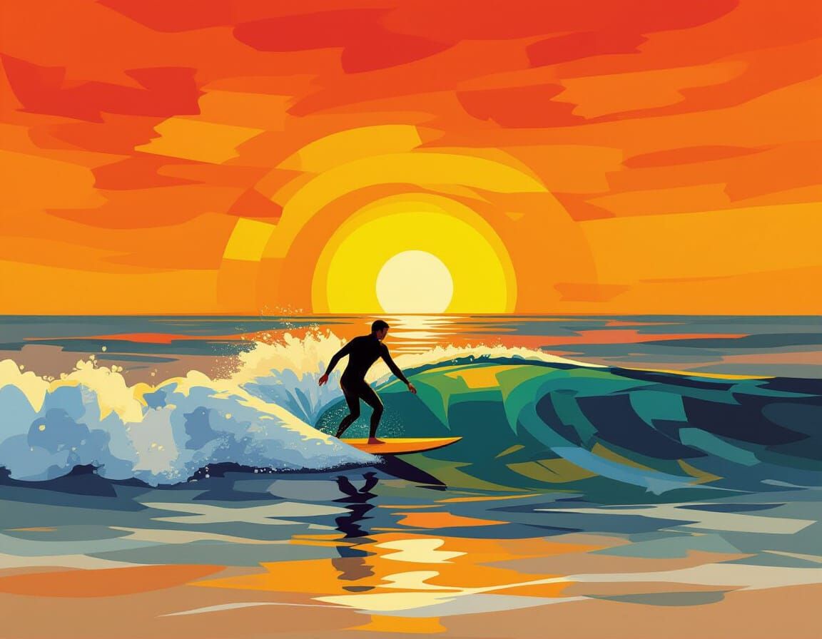 A lone surfer rides a wave during a molten gold sunset. Warm, vibrant colors and expressive brushstrokes create a serene atmosphere in this painting with geometric forms and color fields.