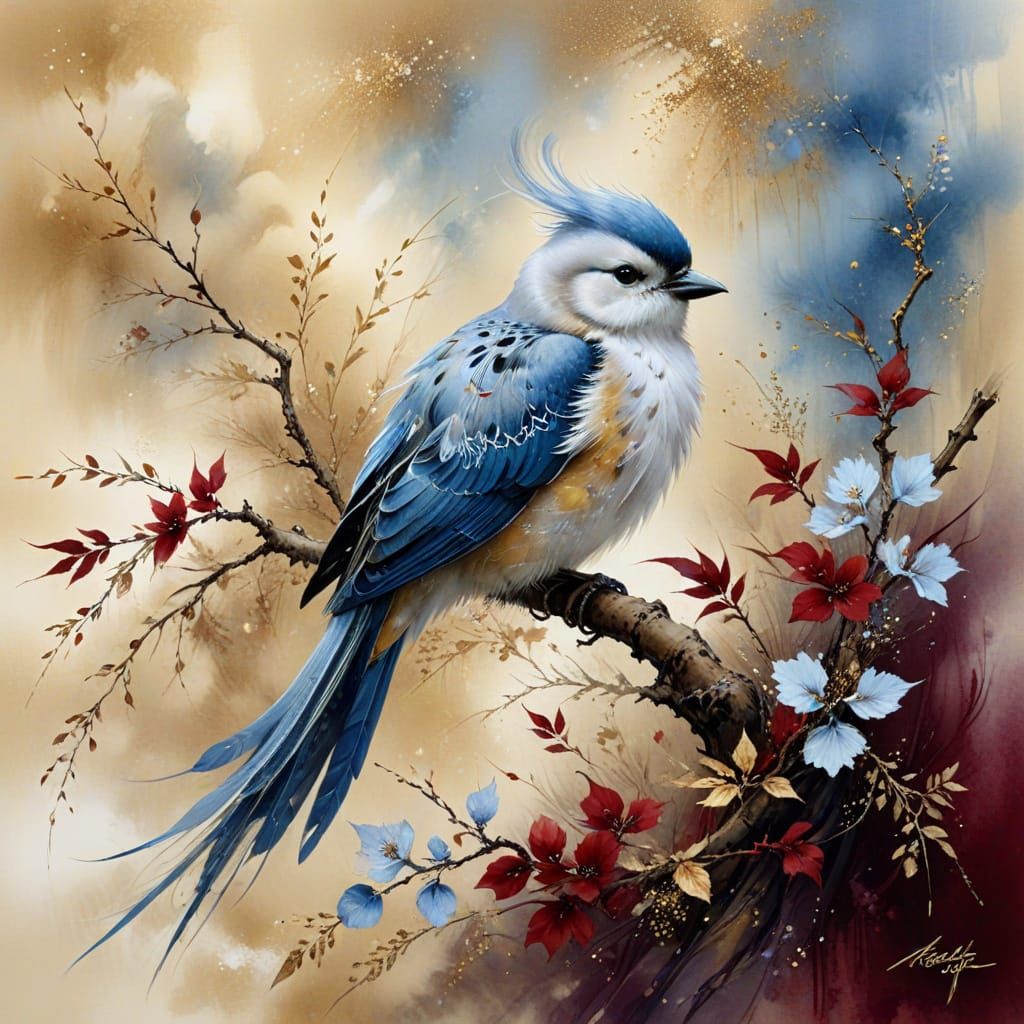 A watercolour painting inspired by Chinese art. It features a serene landscape with a fluffy bird, soft, diffused lighting, and a color palette of beige, blue, gold, and silver.
