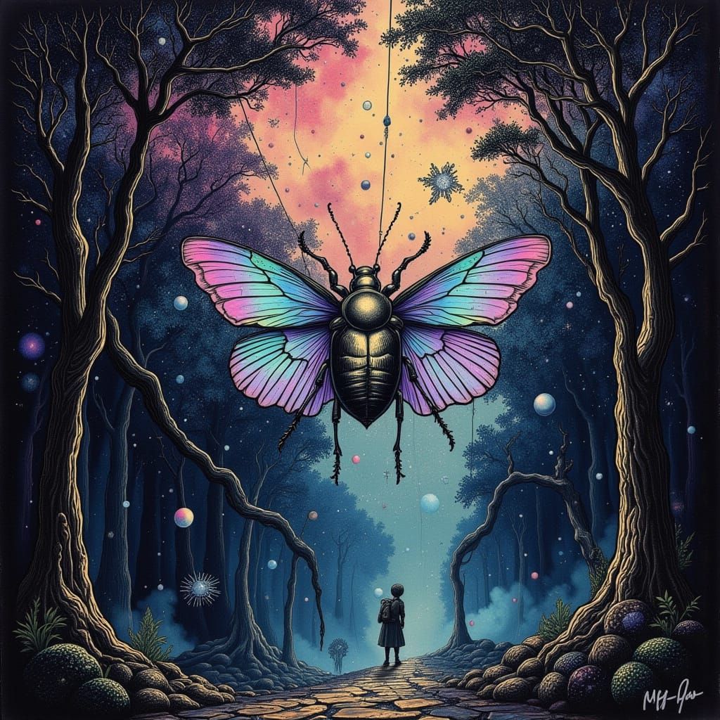 This image features a giant, glowing beetle on a misty spiderweb between ancient trees. It evokes surrealism and cosmic wonder with an otherworldly glow, rendered with airbrushing techniques.