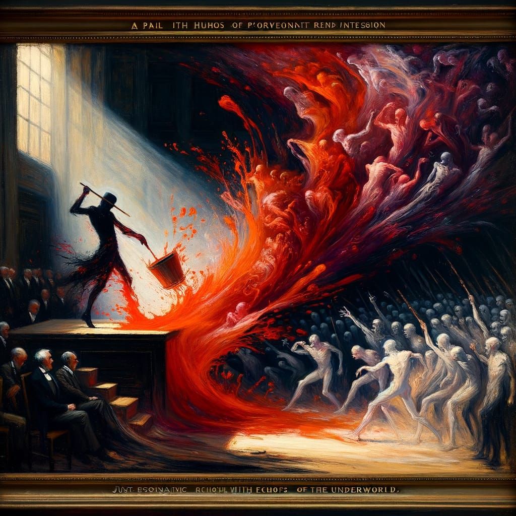 This abstract painting depicts a dramatic moment in art history, where an artist's bold gesture gives birth to a spectral legion, resonating with echoes of the underworld, in a rich palette of blood red and black hues.