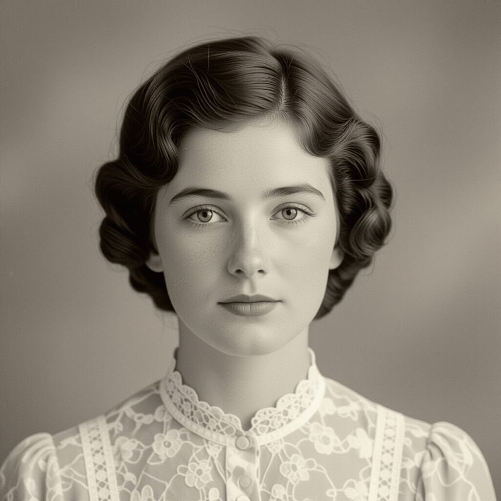 This image shows a photorealistic vintage portrait of a person. The style evokes classic photography with attention to detail and lighting.