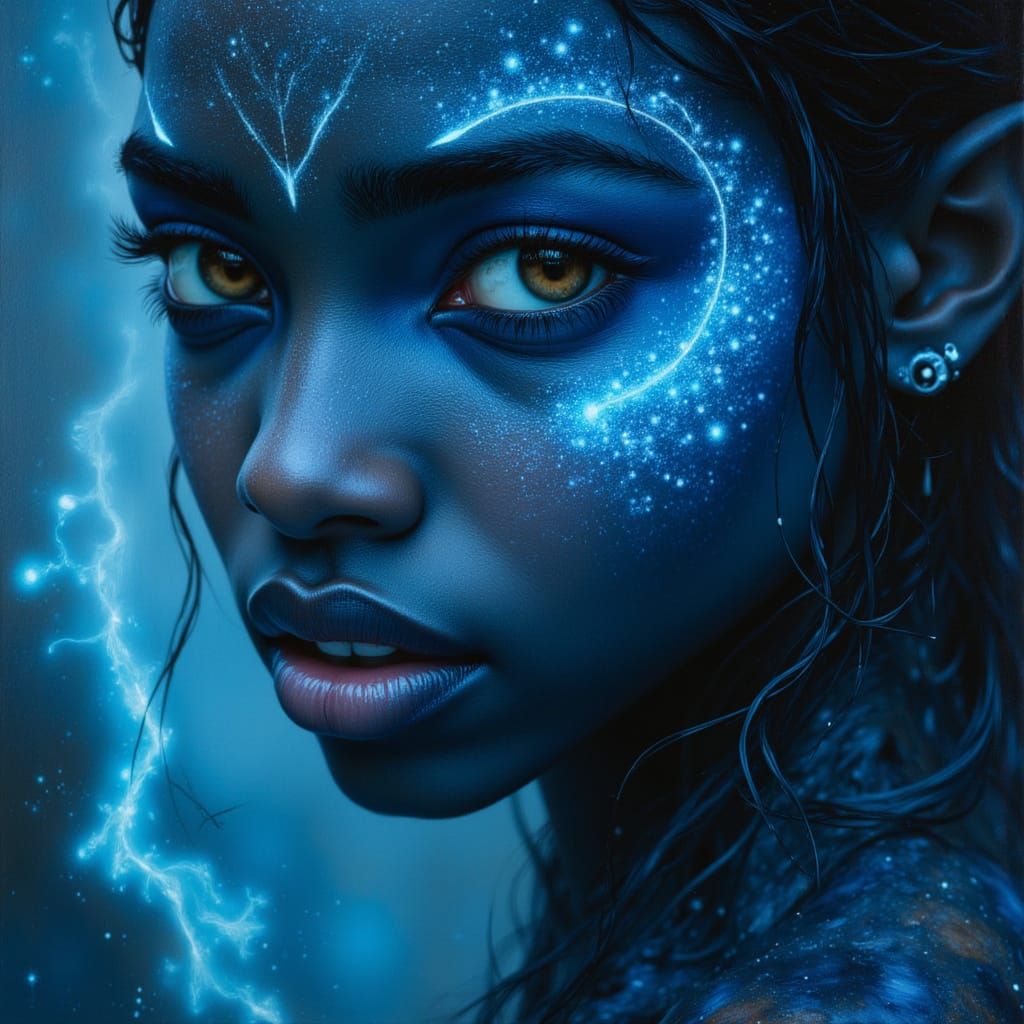 This image shows an ethereal, symmetrical alien goddess with blue skin and bioluminescent markings. Vogue photography blends with digital painting and art nouveau in cosmic colors to create this hyperrealistic portrait.