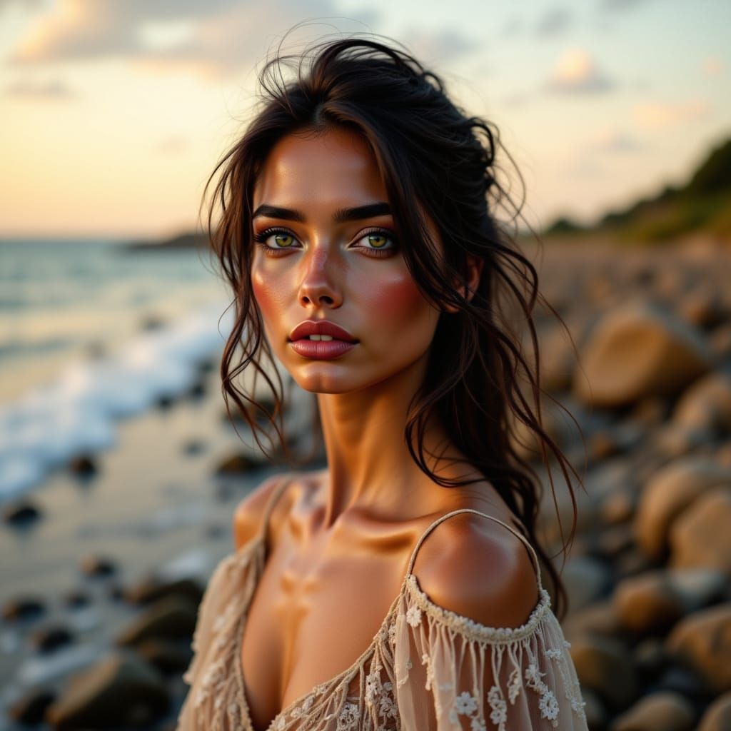 This image shows an elegant young woman standing on the Hampshire coast. Captured with photorealistic rendering, the portrait features soft summer evening hues and subtle expressions.