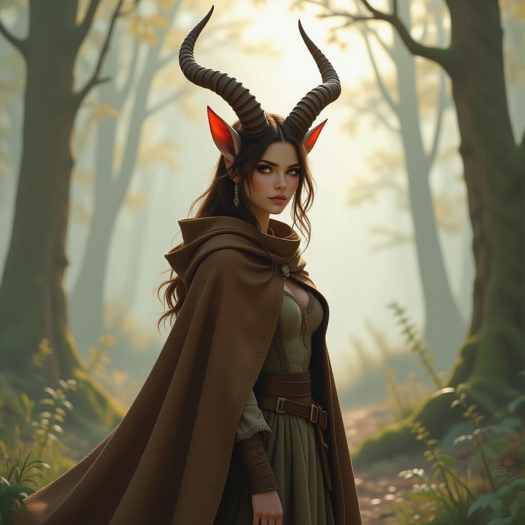This image shows a female faun with detailed horns and fur, cloaked in earth tones. The faun stands in a misty, sunlit forest, rendered with hyper-realistic detail and ethereal lighting.