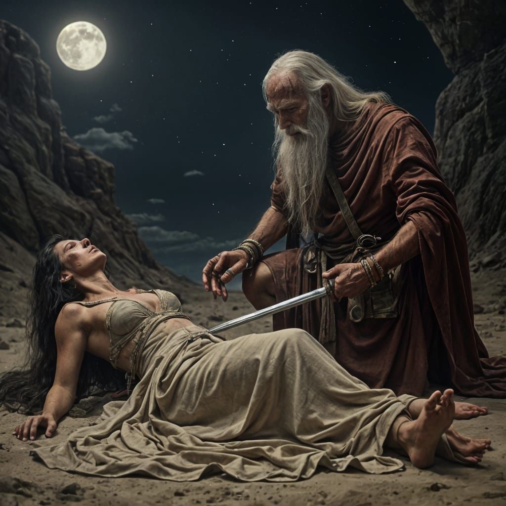A poignant scene of a woman mourning her father's brutal death in a desert graveyard under the full moon, as an alien figure cleans its sword nearby.