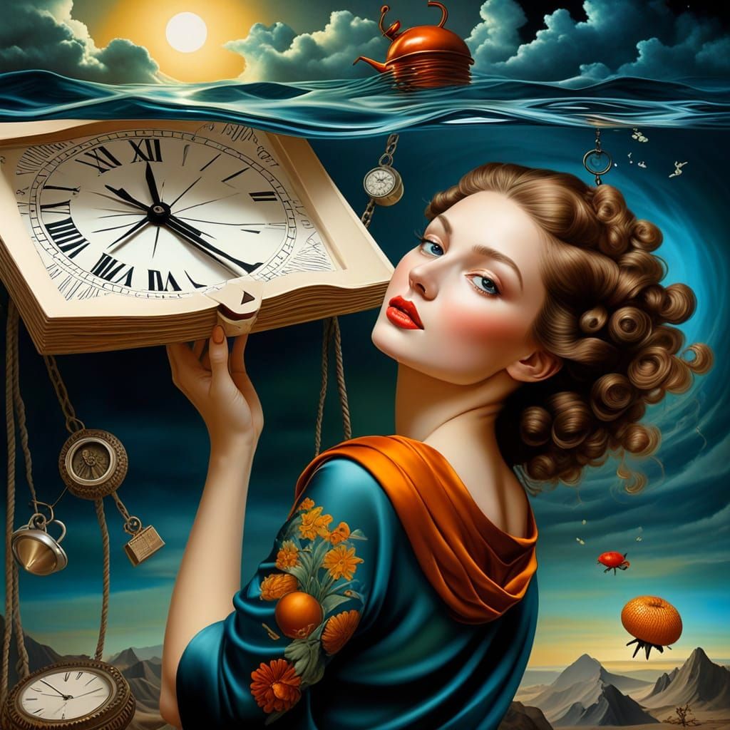 photorealistic full-height image of eccentrically dressed happy captivating magnetic mature lady by Karol Bak, Amanda Clark, Cesar Santos, Christiane Vleugels, Corinne Day, Emily Balivet, Esao Andrews, Gertrude Abercrombie in fantastic surrealistic scene by Catrin Welz-Stein, Salvador Dali, Johfra Bosschart, ...