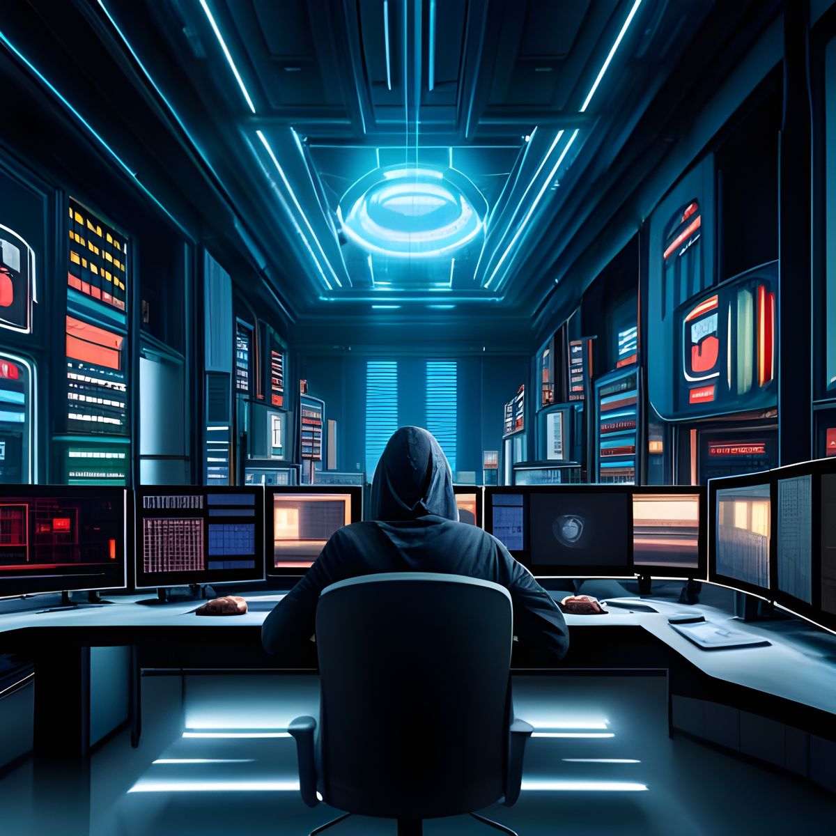 A striking picture of a hacker amidst a bank of glowing computer screens. This cyberpunk sci-fi art style image is highly detailed and evokes a sense of technological immersion.