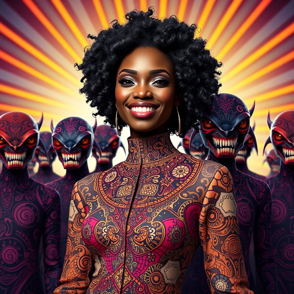 This image shows a smiling, dark-skinned woman in patterned clothing, confidently posing with fashion show models. The scene features a radial gradient background and is rendered as 3D digital art.
